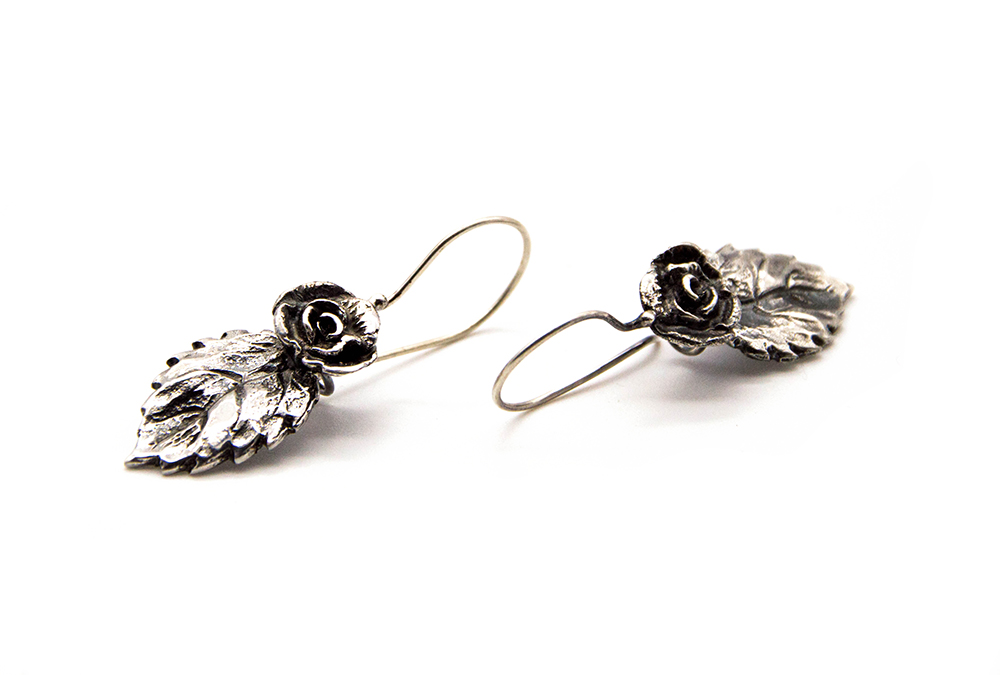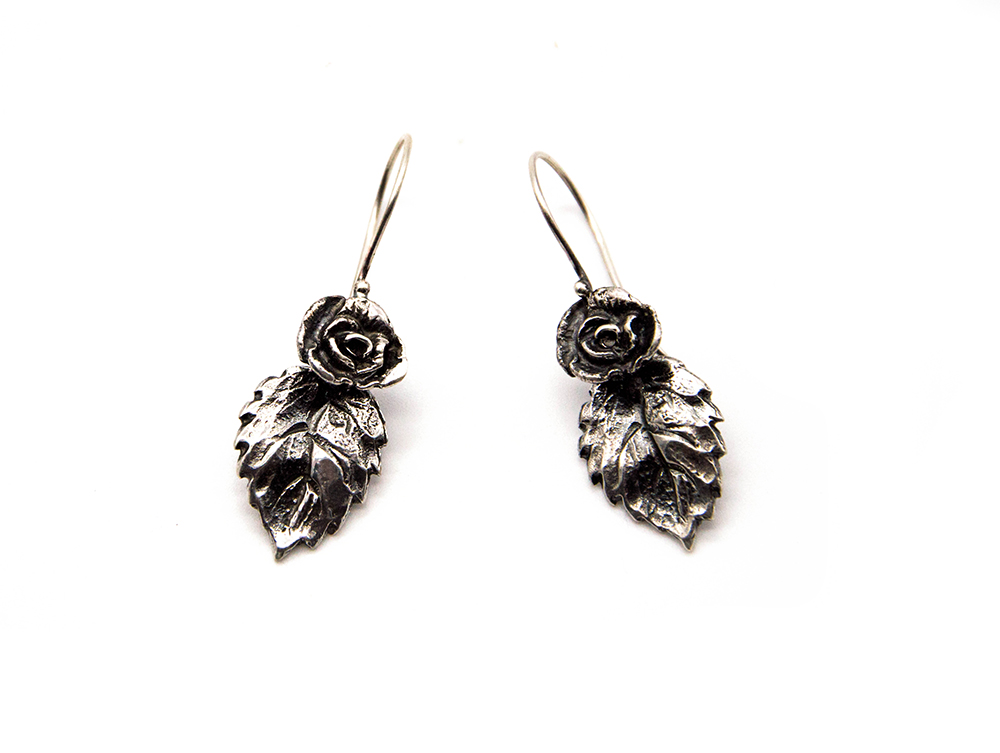 Orecchini argento 925 con rosa e foglia. Fatti a mano in Toscana.